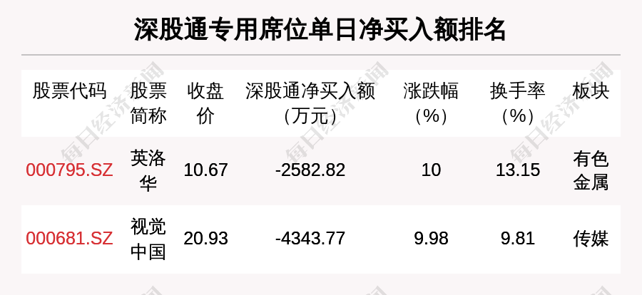 在龙虎榜中,涉及深股通专用席位的个股有2只,视觉中国的深股通专用席位净卖出额最大,净卖出4343.77万元。