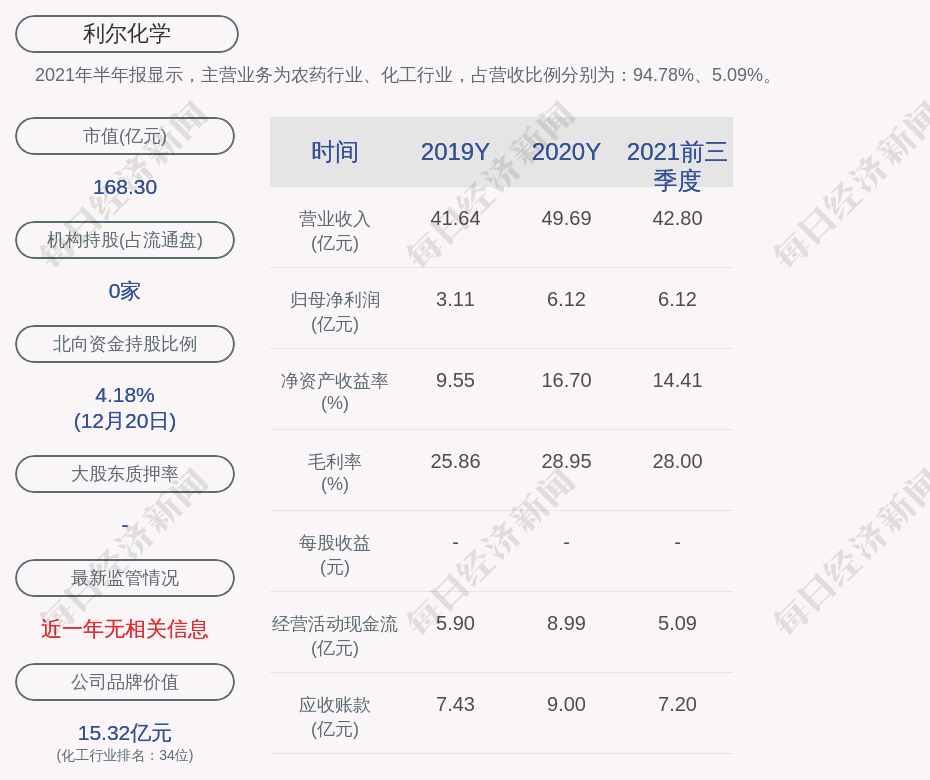 2021年半年报显示,利尔化学的主营业务为农药行业、化工行业,占营收比例分别为:94.78%、5.09%。