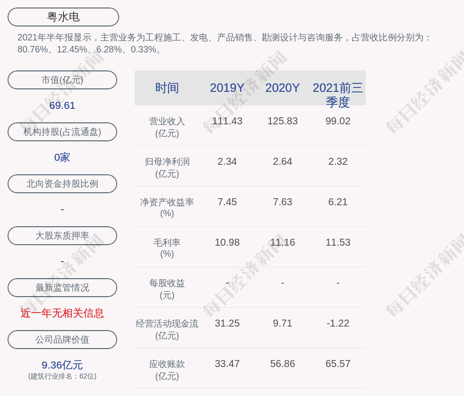 2021年半年报显示,粤水电的主营业务为工程施工、发电、产品销售、勘测设计与咨询服务,占营收比例分别为:80.76%、12.45%、6.28%、0.33%。