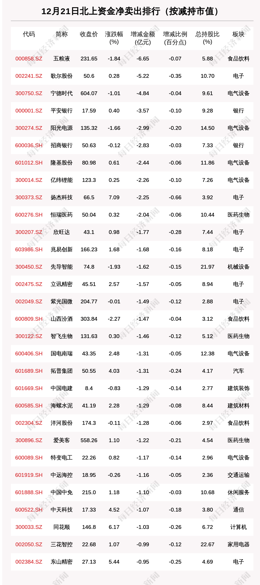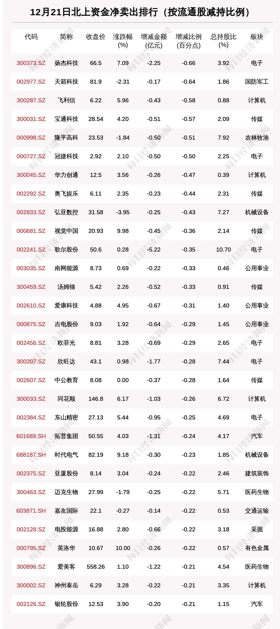 每经AI快讯,12月21日,北上资金净卖出的个股共有559只,北上资金减仓比例超1%的有425只。其中,扬杰科技(300373.SZ,收盘价:66.5元)减仓比例最为明显,最新持股比例3.92%,环比减少0.66个百分点。其他北上资金减仓比例较多的个股还包括天箭科技(002977.SZ,收盘价:81.9元)、飞利信(300287.SZ,收盘价:6.22元)、宝通科技(300031.SZ,收盘价:28.54元)。