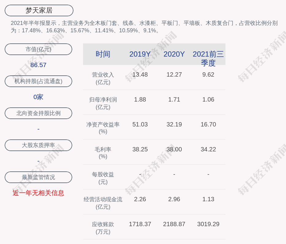 2021年半年报显示,梦天家居的主营业务为全木板门套、线条、水漆柜、平板门、平墙板、木质复合门,占营收比例分别为:17.48%、16.63%、15.67%、11.41%、10.59%、9.1%。