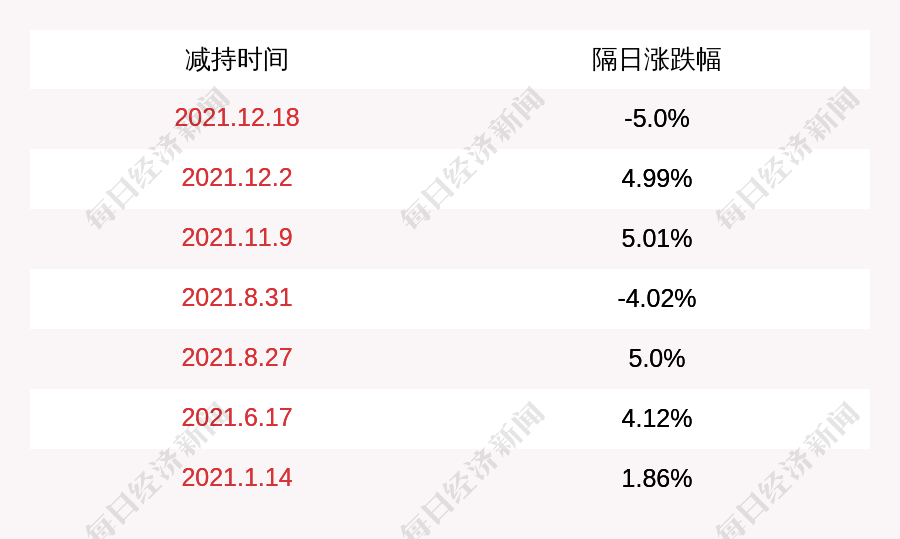 2. *ST德新上次发布减持公告是2021年12月18日,第二个交易日下跌5.0%,*ST德新近一年共发布8次减持类公告。
