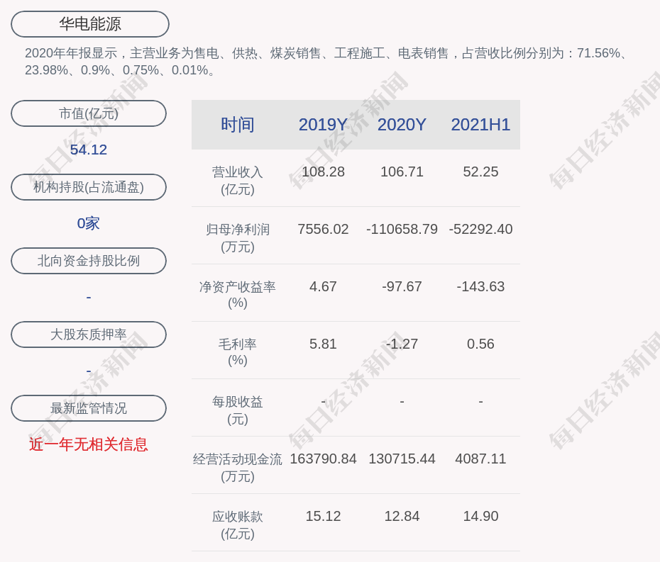 2020年年报显示,华电能源的主营业务为售电、供热、煤炭销售、工程施工、电表销售,占营收比例分别为:71.56%、23.98%、0.9%、0.75%、0.01%。