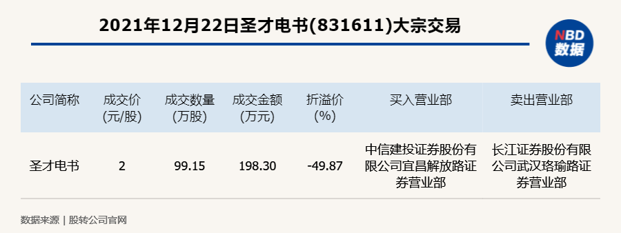 每经讯,2021年12月22日,新三板基础层公司圣才电书(831611)发生一笔大宗交易,成交价2元/股,成交数量99.15万股,成交金额198.30万元,折价49.87%。买入营业部是中信建投证券股份有限公司宜昌解放路证券营业部,卖出营业部是长江证券股份有限公司武汉珞瑜路证券营业部。