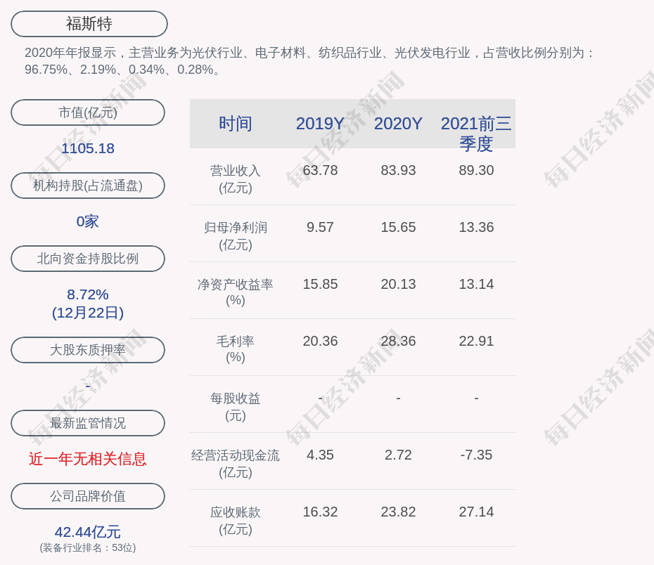 2020年年报显示,福斯特的主营业务为光伏行业、电子材料、纺织品行业、光伏发电行业,占营收比例分别为:96.75%、2.19%、0.34%、0.28%。
