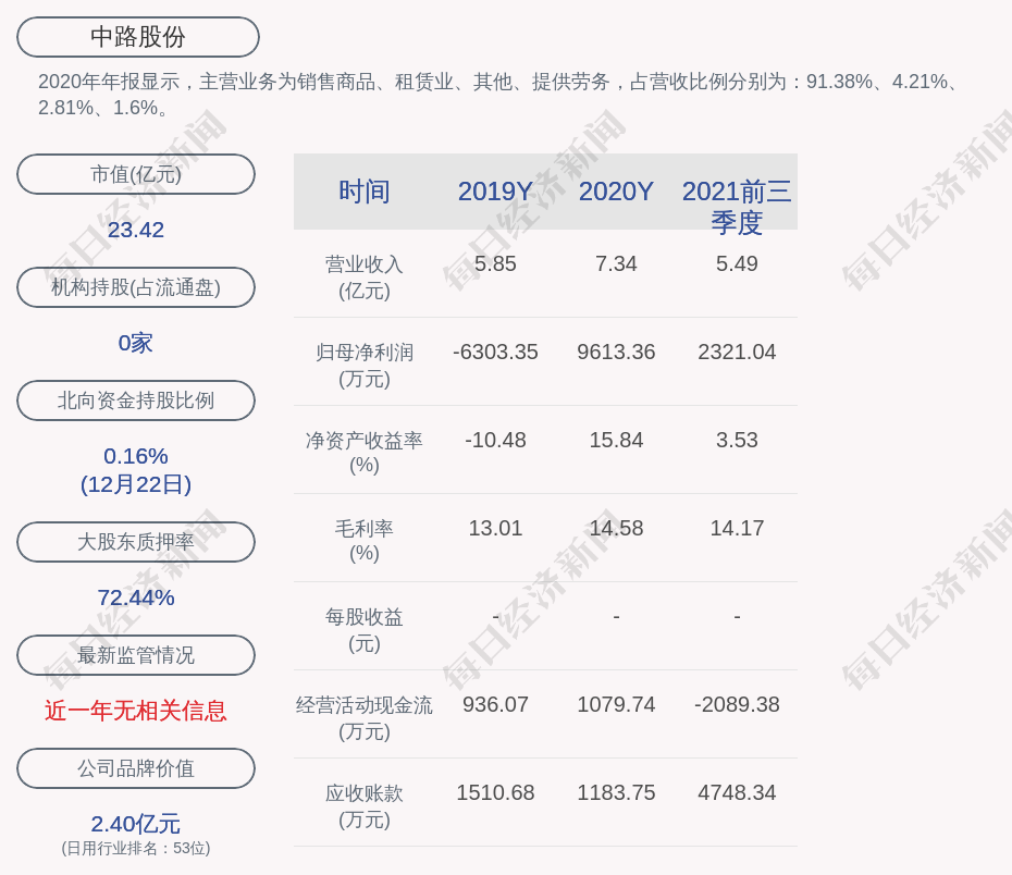 2020年年报显示,中路股份的主营业务为销售商品、租赁业、其他、提供劳务,占营收比例分别为:91.38%、4.21%、2.81%、1.6%。