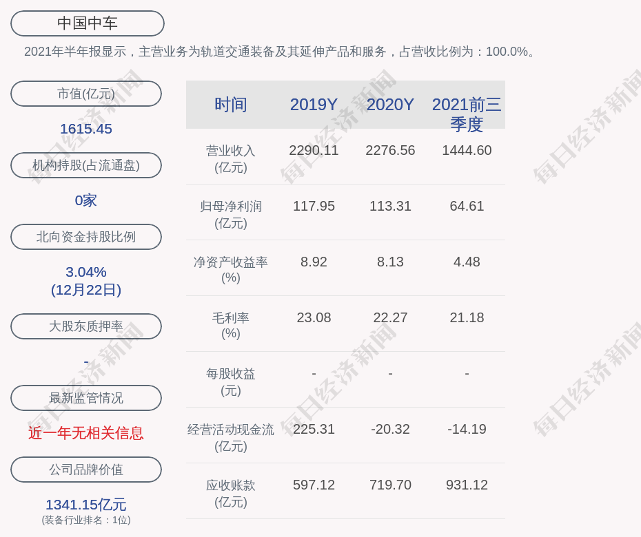2021年半年报显示,中国中车的主营业务为轨道交通装备及其延伸产品和服务,占营收比例为:100.0%。