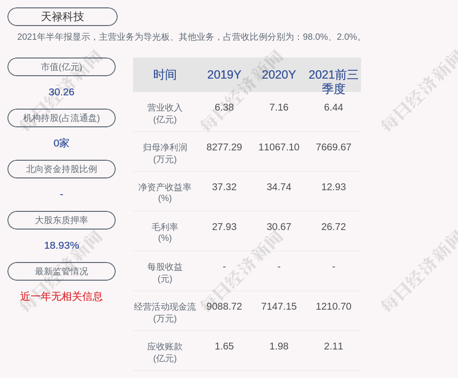 2021年半年报显示,天禄科技的主营业务为导光板、其他业务,占营收比例分别为:98.0%、2.0%。