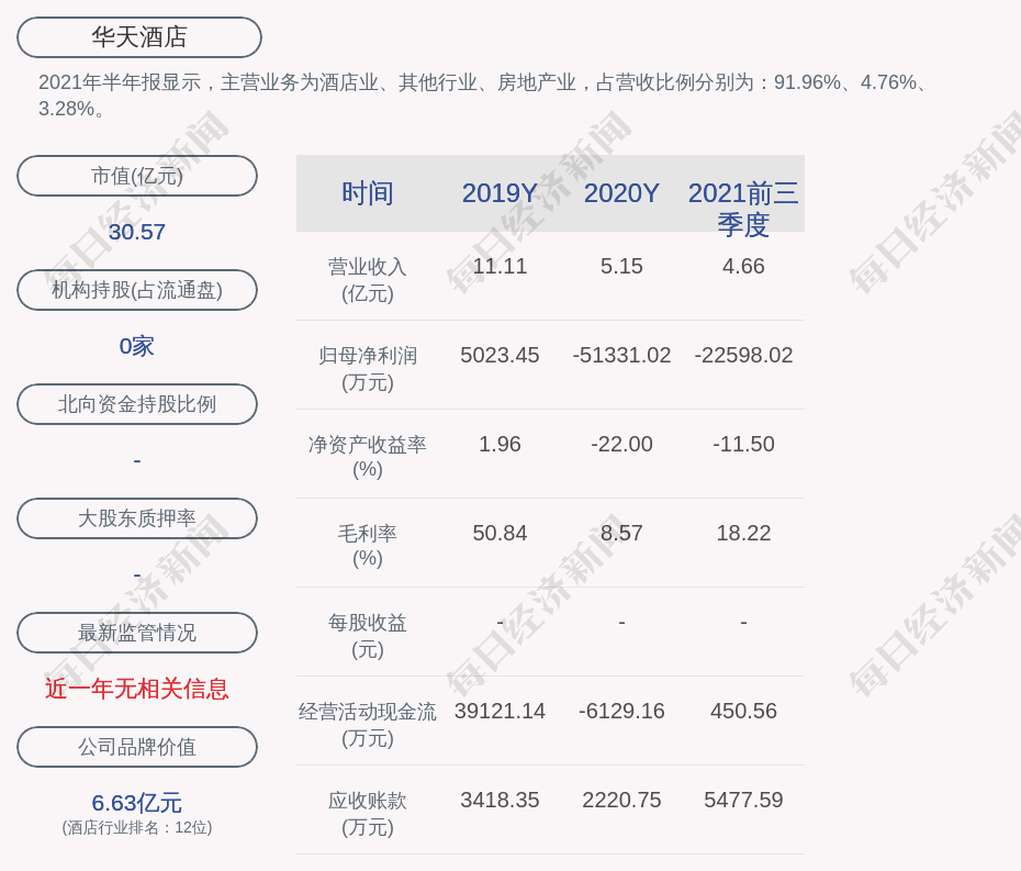 2021年半年报显示,华天酒店的主营业务为酒店业、其他行业、房地产业,占营收比例分别为:91.96%、4.76%、3.28%。
