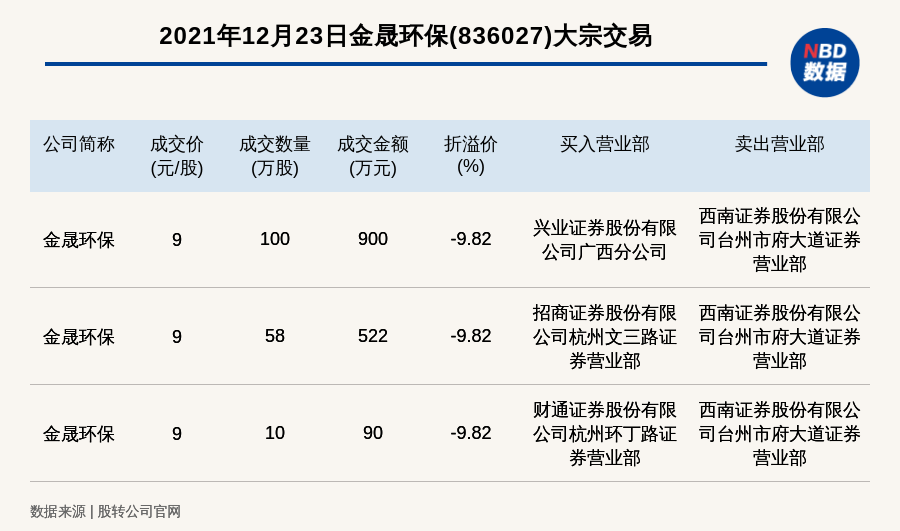 每经讯,2021年12月23日,新三板创新层公司金晟环保(836027)发生3笔大宗交易,总成交金额为1512万元,成交金额最高的一笔成交价9元/股,成交数量100万股,成交金额900万元,折价9.82%。买入营业部是兴业证券股份有限公司广西分公司,卖出营业部是西南证券股份有限公司台州市府大道证券营业部。