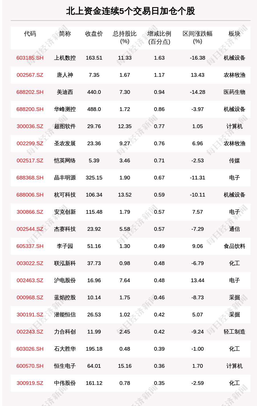 每经AI快讯,12月23日,北上资金连续5个交易日买入59个股。北上资金连续5个交易日加仓个股中,上机数控(603185.SH,收盘价:163.51元)增持比例增幅最大,5个交易日增持1.63个百分点,其他增持比例较大的个股包括唐人神(002567.SZ,收盘价:7.35元)、美迪西(688202.SH,收盘价:440.0元)、华峰测控(688200.SH,收盘价:488.0元),分别增持1.17个百分点、0.94个百分点、0.86个百分点。