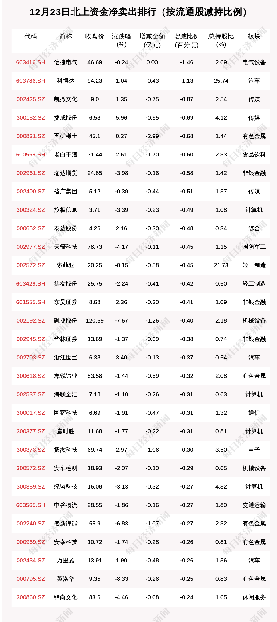 每经AI快讯,12月23日,北上资金净卖出的个股共有754只,北上资金减仓比例超1%的有613只。其中,信捷电气(603416.SH,收盘价:46.69元)减仓比例最为明显,最新持股比例2.69%,环比减少1.46个百分点。其他北上资金减仓比例较多的个股还包括科博达(603786.SH,收盘价:94.23元)、凯撒文化(002425.SZ,收盘价:9.0元)、捷成股份(300182.SZ,收盘价:6.58元)。