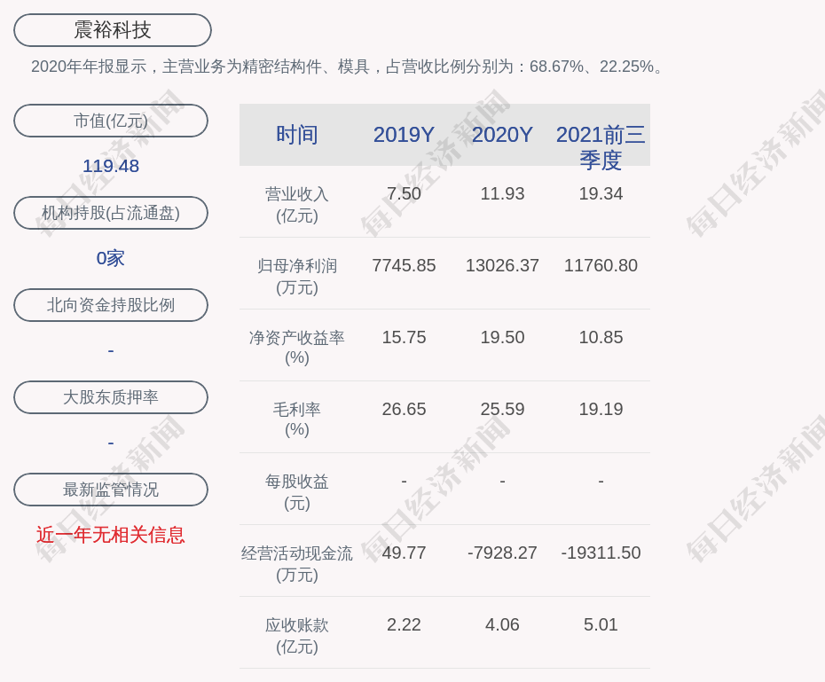 2020年年报显示,震裕科技的主营业务为精密结构件、模具,占营收比例分别为:68.67%、22.25%。