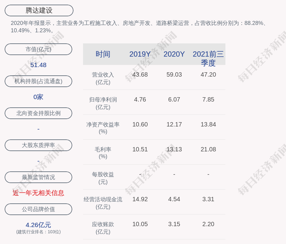 2020年年报显示,腾达建设的主营业务为工程施工收入、房地产开发、道路桥梁运营,占营收比例分别为:88.28%、10.49%、1.23%。
