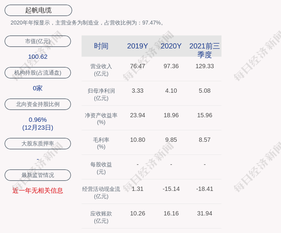2020年年报显示,起帆电缆的主营业务为制造业,占营收比例为:97.47%。