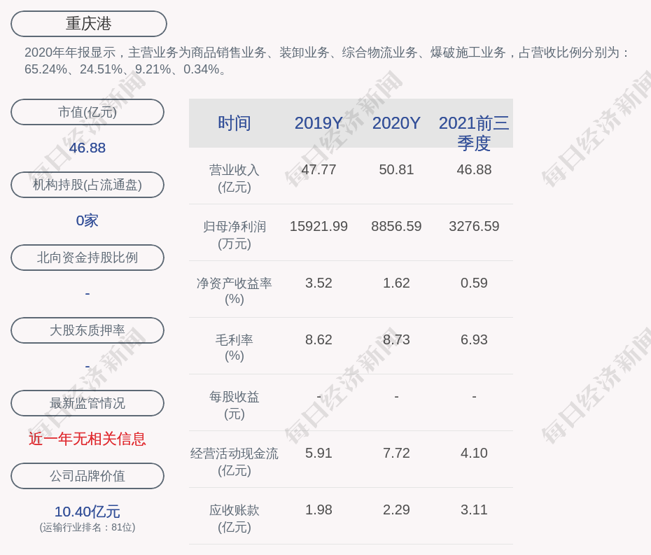 2020年年报显示,重庆港的主营业务为商品销售业务、装卸业务、综合物流业务、爆破施工业务,占营收比例分别为:65.24%、24.51%、9.21%、0.34%。