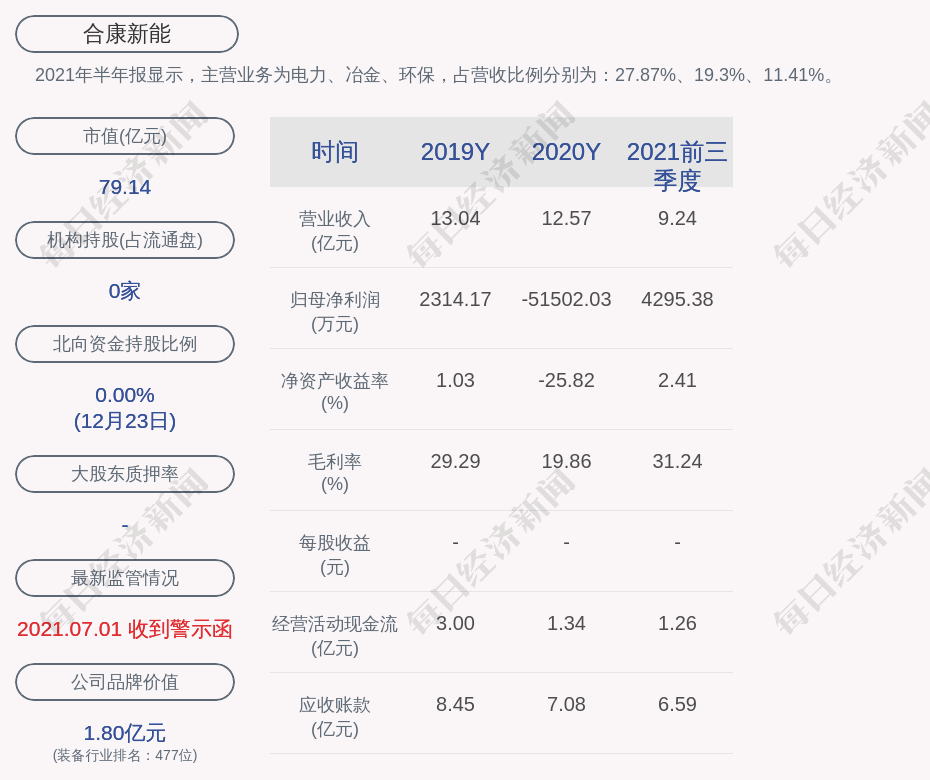 2021年半年报显示,合康新能的主营业务为电力、冶金、环保,占营收比例分别为:27.87%、19.3%、11.41%。