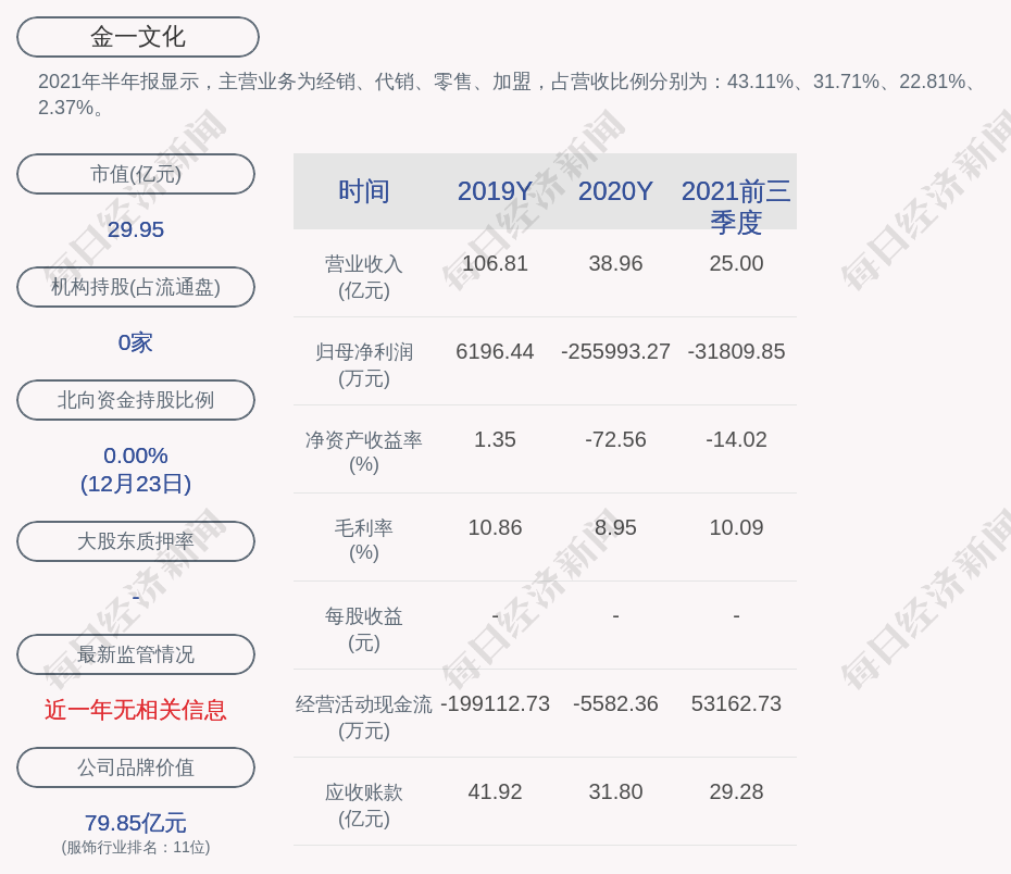 2021年半年报显示,金一文化的主营业务为经销、代销、零售、加盟,占营收比例分别为:43.11%、31.71%、22.81%、2.37%。