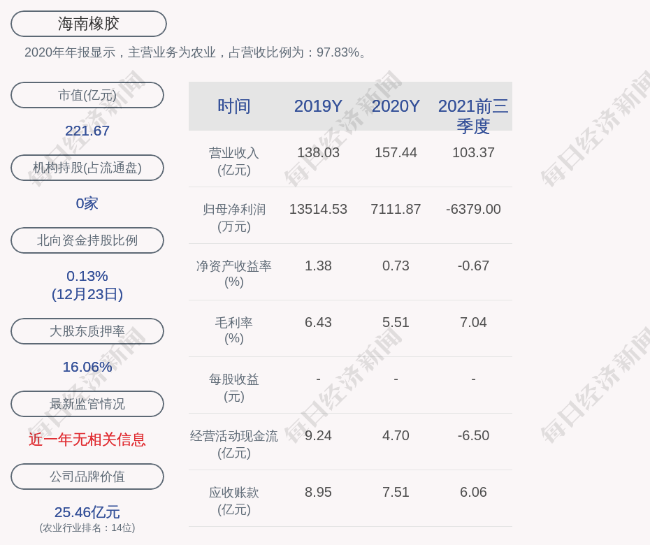 2020年年报显示,海南橡胶的主营业务为农业,占营收比例为:97.83%。