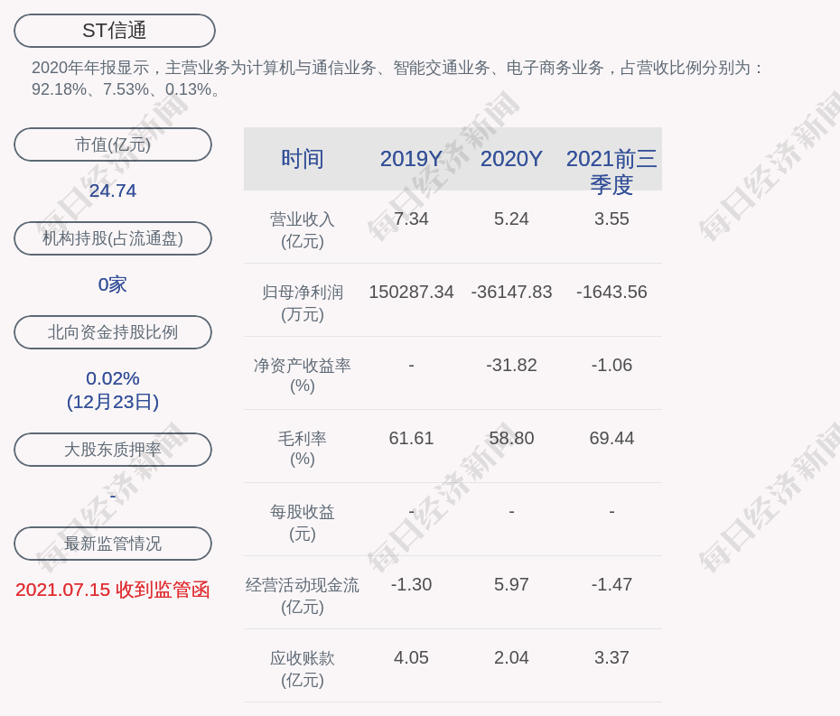 2020年年报显示,ST信通的主营业务为计算机与通信业务、智能交通业务、电子商务业务,占营收比例分别为:92.18%、7.53%、0.13%。