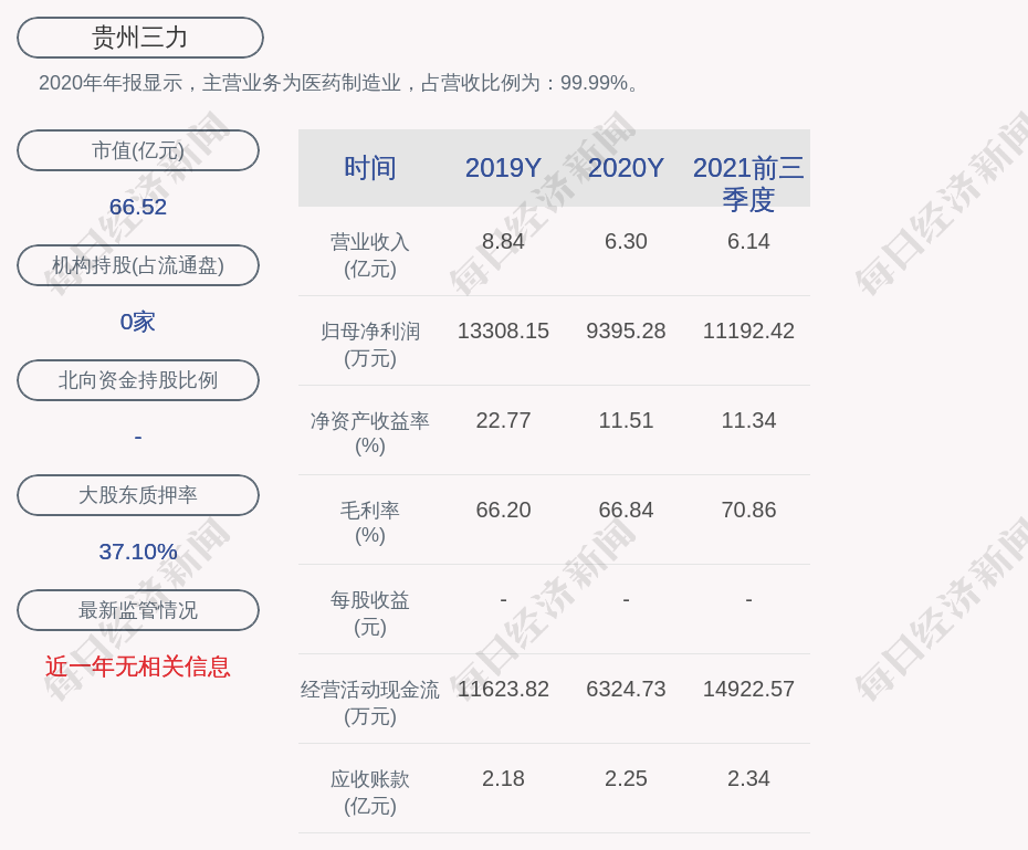 2020年年报显示,贵州三力的主营业务为医药制造业,占营收比例为:99.99%。