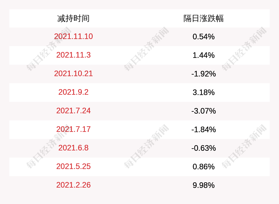 3. 延安必康上次发布减持公告是2021年11月10日,第二个交易日上涨0.54%,延安必康近一年共发布10次减持类公告。