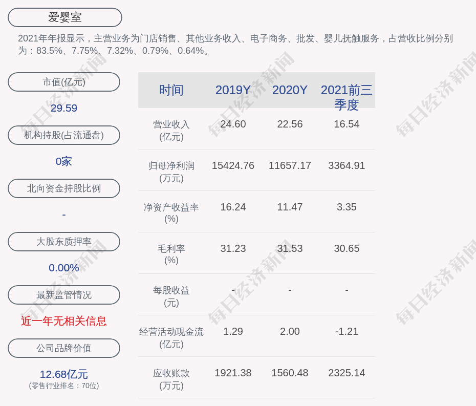 2021年年报显示,爱婴室的主营业务为门店销售、其他业务收入、电子商务、批发、婴儿抚触服务,占营收比例分别为:83.5%、7.75%、7.32%、0.79%、0.64%。