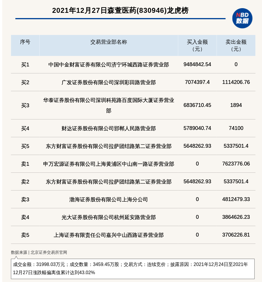 每经讯,2021年12月27日,北交所上市公司森萱医药(830946)登上龙虎榜,交易方式是连续竞价,披露原因是2021年12月24日至2021年12月27日涨跌幅偏离值累计达到43.02%,成交数量3459.45万股,成交金额31998.03万元。买一席位为中国中金财富证券有限公司济宁环城西路证券营业部,买入948.48万元;卖一席位为申万宏源证券有限公司上海黄浦区中山南一路证券营业部,卖出762.38万元。