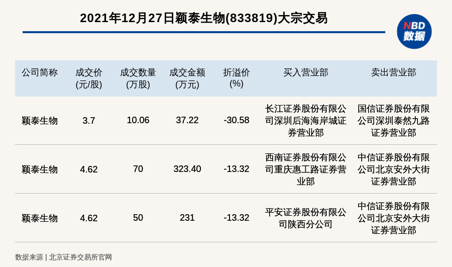 每经讯,2021年12月27日,北交所上市公司颖泰生物(833819)发生3笔大宗交易,折价率最高的一笔成交价3.7元/股,成交数量10.06万股,成交金额37.22万元,折价30.58%。买入营业部是长江证券股份有限公司深圳后海海岸城证券营业部,卖出营业部是国信证券股份有限公司深圳泰然九路证券营业部。