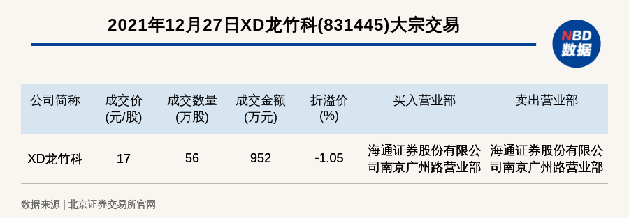 每经讯,2021年12月27日,北交所上市公司龙竹科技(831445)发生一笔大宗交易,成交价17元/股,成交数量56万股,成交金额952万元,折价1.05%。买入营业部是海通证券股份有限公司南京广州路营业部,卖出营业部是海通证券股份有限公司南京广州路营业部。