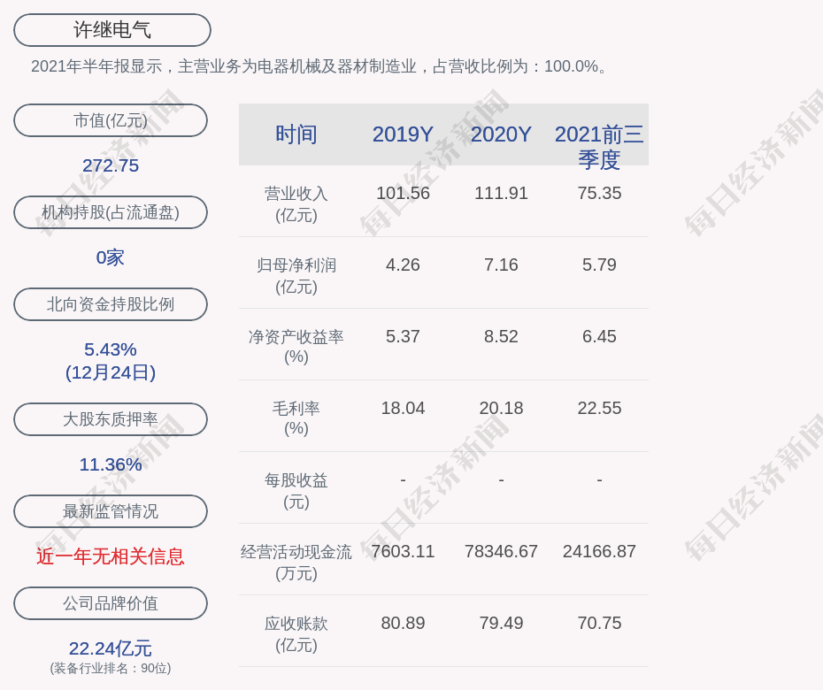 2021年半年报显示,许继电气的主营业务为电器机械及器材制造业,占营收比例为:100.0%。