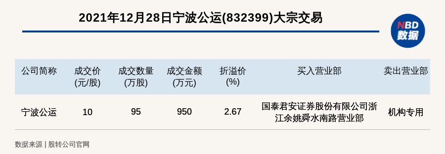 每经讯,2021年12月28日,新三板创新层公司宁波公运(832399)发生一笔大宗交易,成交价10元/股,成交数量95万股,成交金额950万元,溢价2.67%。买入营业部是国泰君安证券股份有限公司浙江余姚舜水南路营业部,卖出营业部是机构专用。