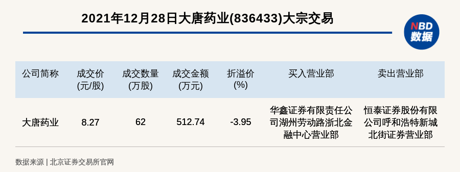 每经讯,2021年12月28日,北交所上市公司大唐药业(836433)发生一笔大宗交易,成交价8.27元/股,成交数量62万股,成交金额512.74万元,折价3.95%。买入营业部是华鑫证券有限责任公司湖州劳动路浙北金融中心营业部,卖出营业部是恒泰证券股份有限公司呼和浩特新城北街证券营业部。