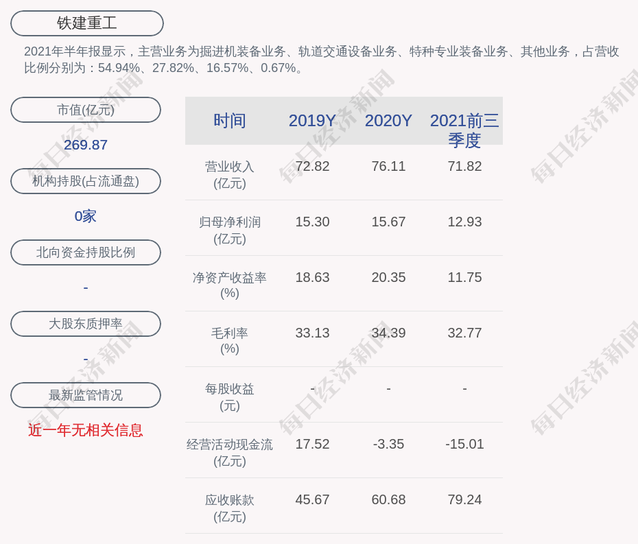 2021年半年报显示,铁建重工的主营业务为掘进机装备业务、轨道交通设备业务、特种专业装备业务、其他业务,占营收比例分别为:54.94%、27.82%、16.57%、0.67%。
