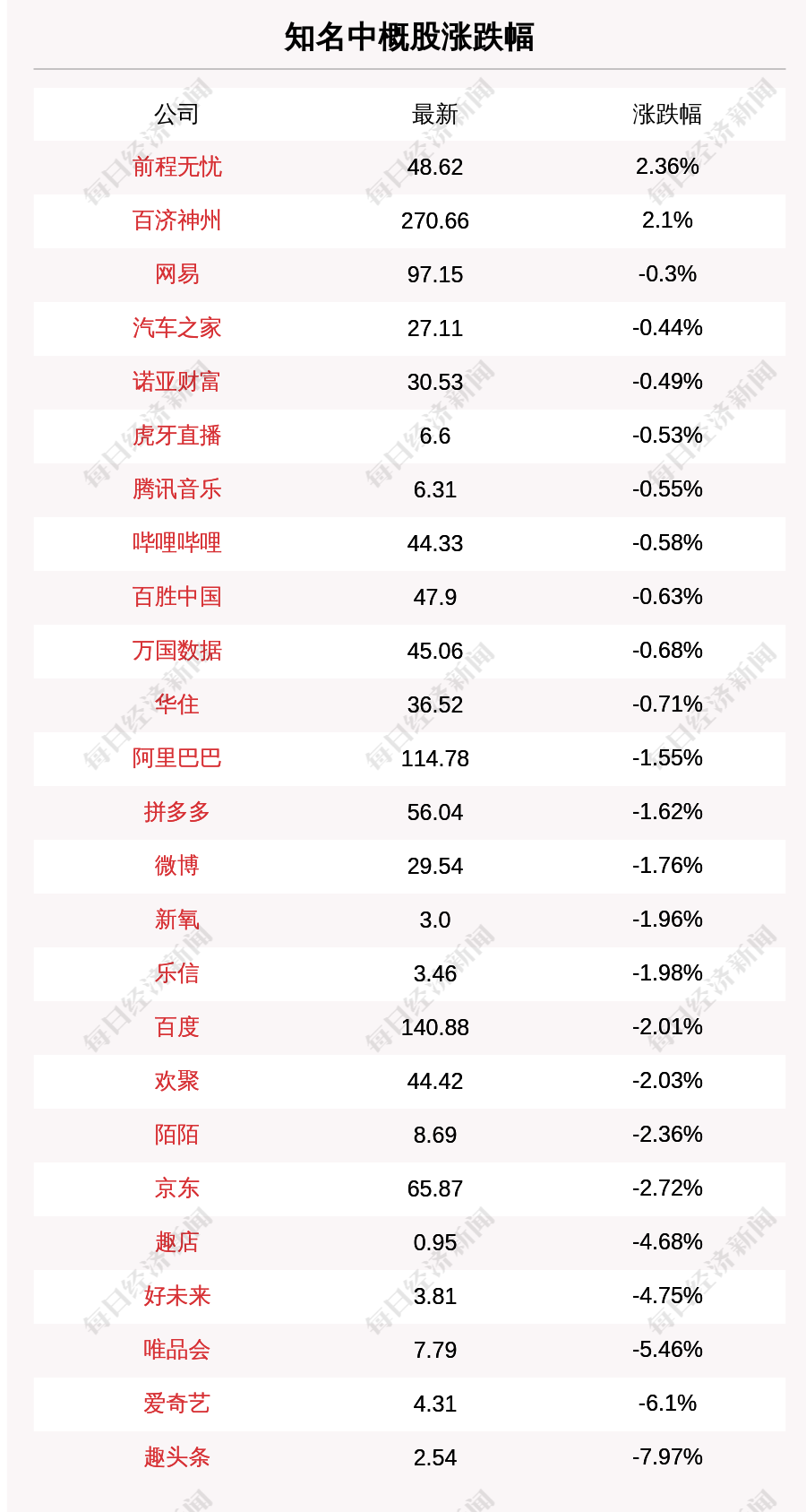 每经AI快讯:北京时间12月29日05:00,知名中概股中前程无忧、百济神州涨幅居前,收盘分别上涨2.36%、2.1%。趣头条、爱奇艺、唯品会、好未来、趣店跌幅居前,收盘分别下跌7.97%、6.1%、5.46%、4.75%、4.68%。