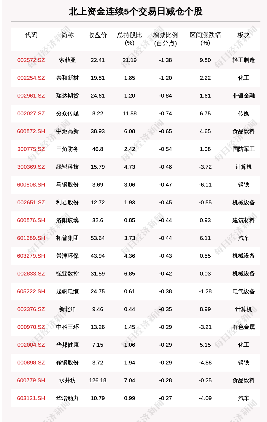 每经AI快讯,12月28日,北上资金连续5个交易日卖出61个股。北上资金连续5个交易日减仓个股中,索菲亚(002572.SZ,收盘价:22.41元)减持比例增幅最大,5个交易日减持1.38百分点,其他跌幅较大的个股包括泰和新材(002254.SZ,收盘价:19.81元)、瑞达期货(002961.SZ,收盘价:24.61元)、分众传媒(002027.SZ,收盘价:8.22元),分别减持1.20个百分点、0.84个百分点、0.74个百分点。