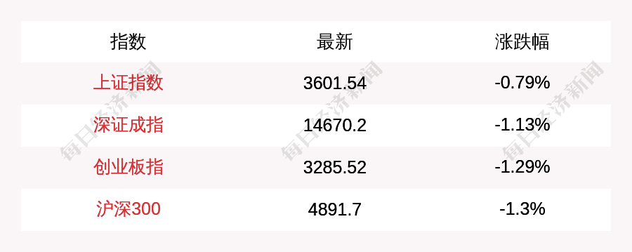 每经AI快讯:北京时间12月29日11:30,上证指数早盘下跌28.57点,跌幅为0.79%,报收3601.54点,成交额2578.35亿元;深证成指下跌167.67点,跌幅为1.13%,报收14670.2点,成交额3808.85亿元;创业板指下跌43.04点,跌幅为1.29%,报收3285.52点,成交额1434.51亿元;沪深300下跌64.26点,跌幅为1.3%,报收4891.7点,成交额1671.61亿元。
