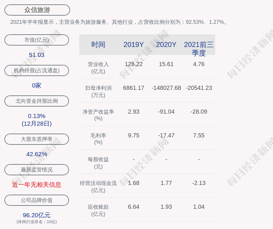 2021年半年报显示,众信旅游的主营业务为旅游服务、其他行业,占营收比例分别为:92.53%、1.27%。