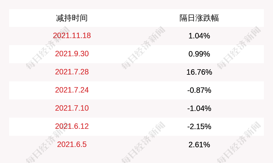 2. 广信材料上次发布减持公告是2021年11月18日,第二个交易日上涨1.04%,广信材料近一年共发布8次减持类公告。