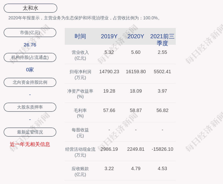 2020年年报显示,太和水的主营业务为生态保护和环境治理业,占营收比例为:100.0%。
