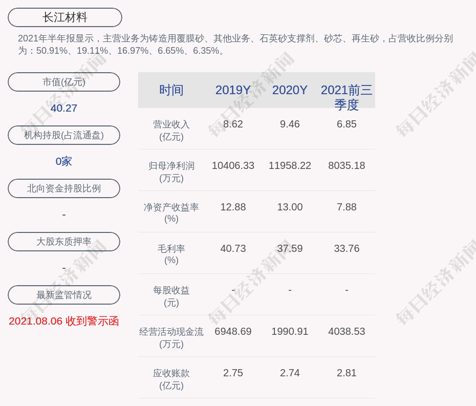 2021年半年报显示,长江材料的主营业务为铸造用覆膜砂、其他业务、石英砂支撑剂、砂芯、再生砂,占营收比例分别为:50.91%、19.11%、16.97%、6.65%、6.35%。