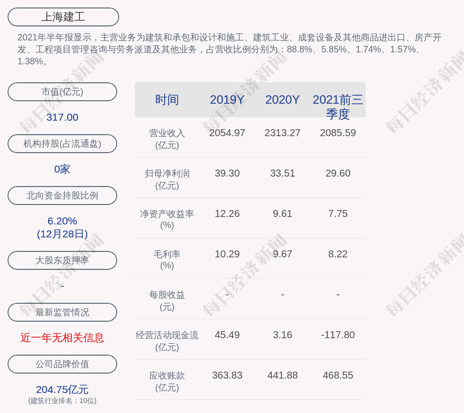 2021年半年报显示,上海建工的主营业务为建筑和承包和设计和施工、建筑工业、成套设备及其他商品进出口、房产开发、工程项目管理咨询与劳务派遣及其他业务,占营收比例分别为:88.8%、5.85%、1.74%、1.57%、1.38%。