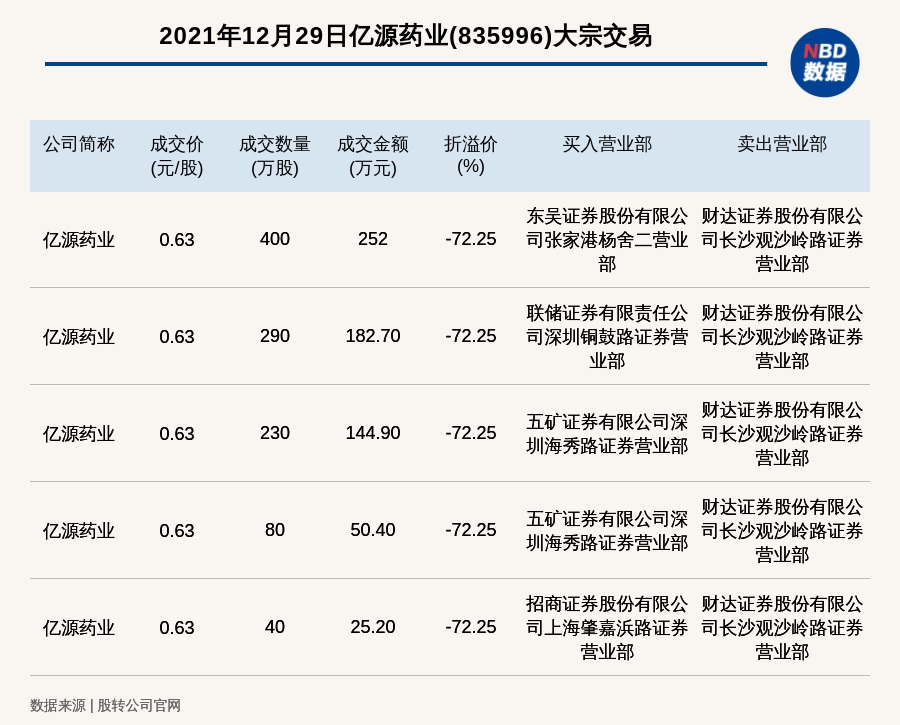 每经讯,2021年12月29日,新三板创新层公司亿源药业(835996)发生5笔大宗交易,总成交金额为655.20万元,成交金额最高的一笔成交价0.63元/股,成交数量400万股,成交金额252万元,折价72.25%。买入营业部是东吴证券股份有限公司张家港杨舍二营业部,卖出营业部是财达证券股份有限公司长沙观沙岭路证券营业部。