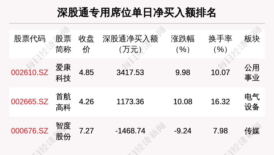 在龙虎榜中,涉及深股通专用席位的个股有3只,爱康科技的深股通专用席位净买入额最大,净买入3417.53万元。