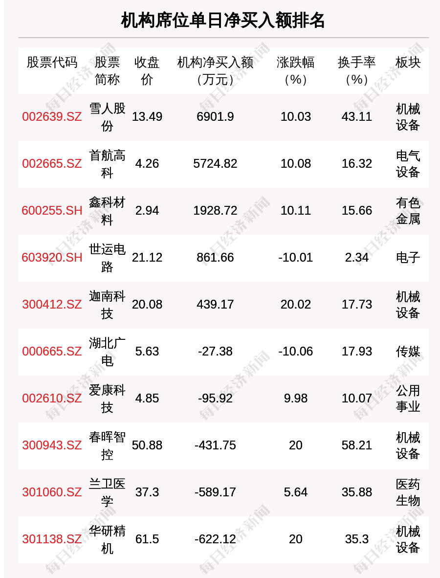 在龙虎榜中,涉及机构专用席位的个股有14只,净买入额前三的是雪人股份、首航高科、鑫科材料,分别为6901.9万元、5724.82万元、1928.72万元。