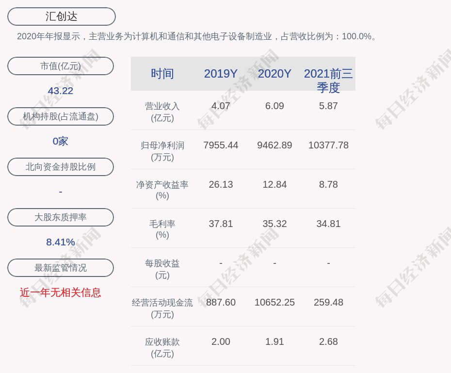 2020年年报显示,汇创达的主营业务为计算机和通信和其他电子设备制造业,占营收比例为:100.0%。