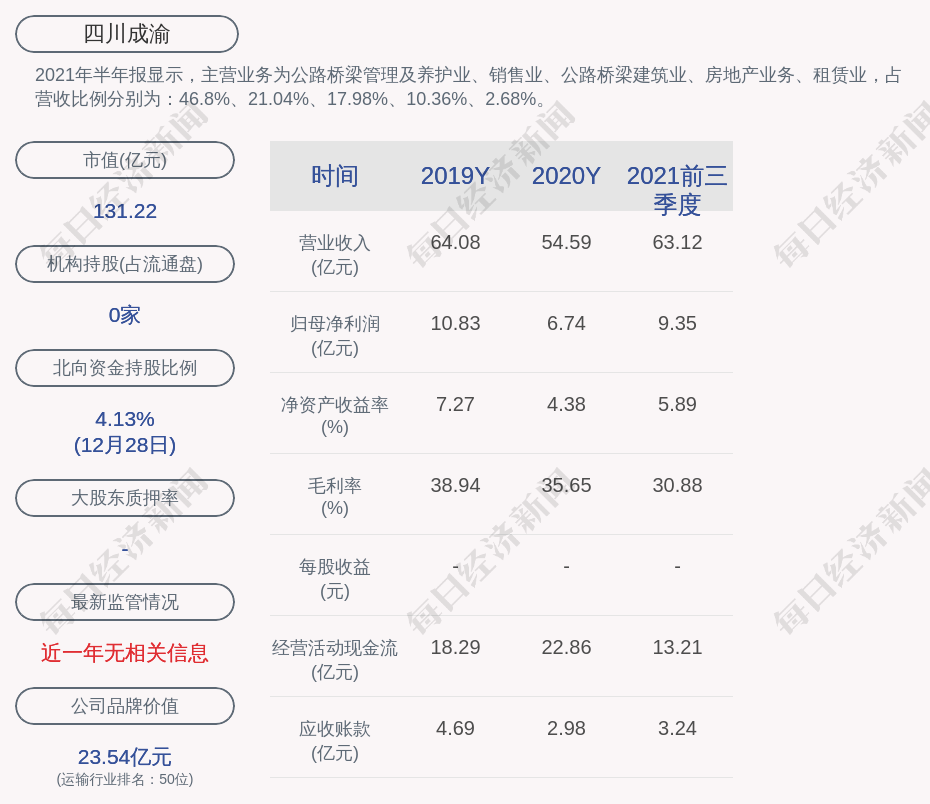 2021年半年报显示,四川成渝的主营业务为公路桥梁管理及养护业、销售业、公路桥梁建筑业、房地产业务、租赁业,占营收比例分别为:46.8%、21.04%、17.98%、10.36%、2.68%。