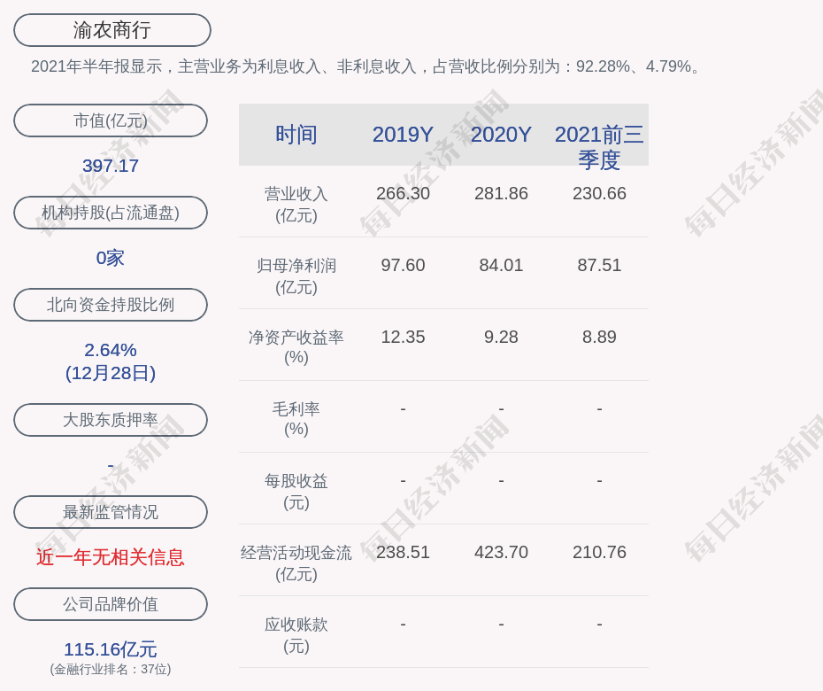 2021年半年报显示,渝农商行的主营业务为利息收入、非利息收入,占营收比例分别为:92.28%、4.79%。