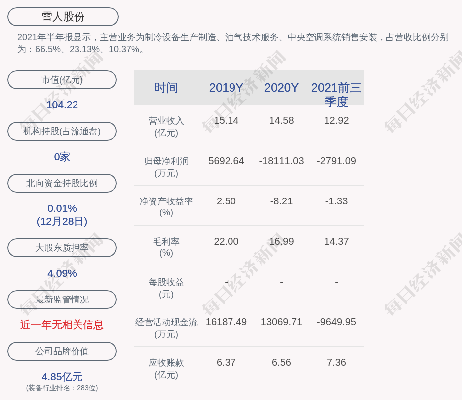 2021年半年报显示,雪人股份的主营业务为制冷设备生产制造、油气技术服务、中央空调系统销售安装,占营收比例分别为:66.5%、23.13%、10.37%。