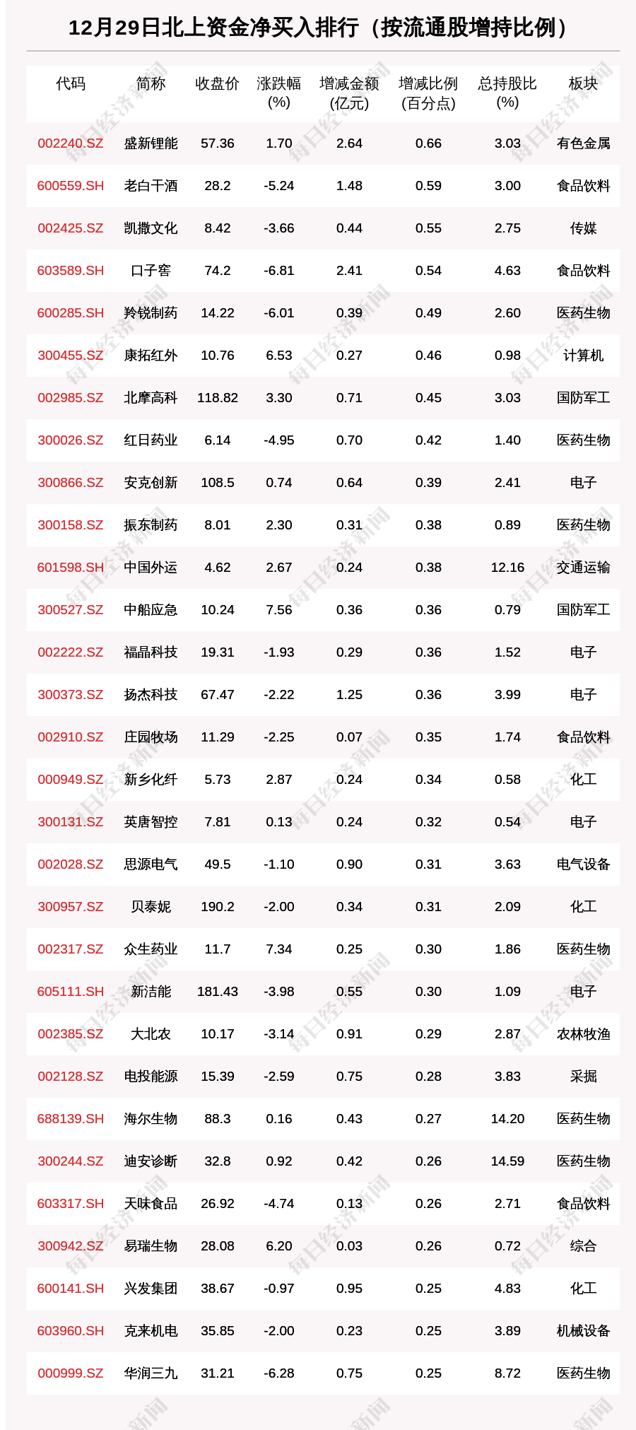 每经AI快讯,12月29日,北上资金净买入的个股共有737只,北上资金加仓比例超1%的有602只。其中,盛新锂能(002240.SZ,收盘价:57.36元)加仓比例最为明显,最新持股比例3.03%,环比增加0.66个百分点。其他北上资金加仓比例较多的个股还包括老白干酒(600559.SH,收盘价:28.2元)、凯撒文化(002425.SZ,收盘价:8.42元)、口子窖(603589.SH,收盘价:74.2元)。